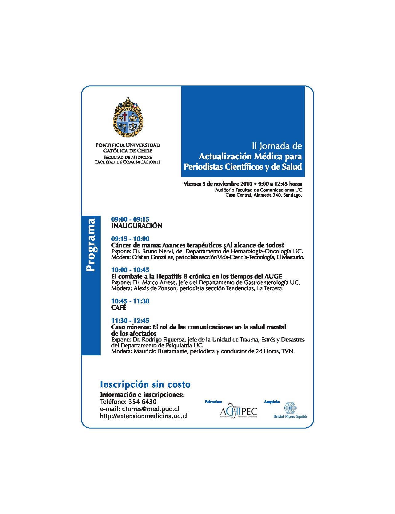 Achipec patrocina actividad organizada por la Facultad de Medicina de la Pontificia Universidad Católica. El Seminario contará con tres conferencias, «Cáncer de mama», «Combate hepatitis B» y «Caso mineros: salud mental de afectados». Entrada Liberada.