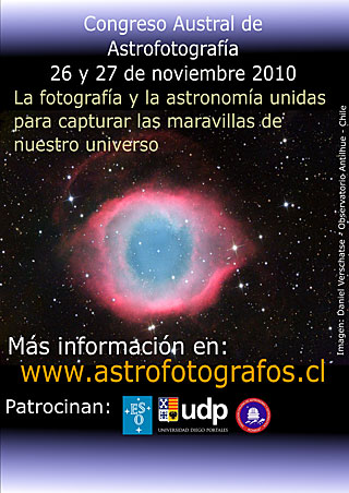 La creciente comunidad de fotógrafos del cielo nocturno en Chile se reunirán en el primer Congreso Austral de Astrofotografía, CAA, que se realizará en las oficinas de ESO en Santiago, los días 26 y 27 de noviembre de 2010.