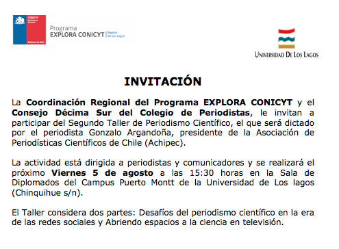 El viernes 5 de agosto se realizará en Puerto Montt el Segundo Taller de Periodismo Científico, el cual será dictado por el periodista Gonzalo Argandoña, presidente de la Asociación de Periodísticas Científicos de Chile (Achipec). La actividad está dirigida a periodistas y comunicadores y se realizará en el Campus Puerto Montt de la Universidad de Los Lagos.