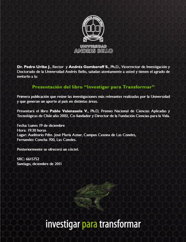 Son 14 capítulos del libro “Investigar para transformar” de la Universidad Andrés Bello, durante el cual el lector se sumerge en estudios científicos tan disímiles como las supernovas, la cordillera de los Andes, Heidegger, física cuántica, un modelo de triciclo solar, la genética de la fruta, microbiología, nanotecnología para la medicina, acuicultura, enfermedades neurodegenerativas, entre muchas otras áreas.