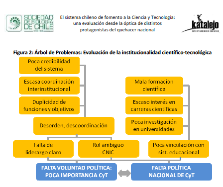 Recientemente la Sociedad de Biología de Chile encargó al Centro de Investigaciones Sociales Katalejo un informe sobre el sistema chileno de fomento a la ciencia y tecnologia. Algunas dramáticas conclusiones son: «Duplicidad de funciones y objetivos entre los distintos organismos que administran instrumentos de fomento a la investigación… escaso diálogo y coordinación entre las distintas instituciones. No parece existir una instancia efectiva de coordinación. Poca credibilidad frente a la autoridad económica, lo que limita la asignación de recursos».