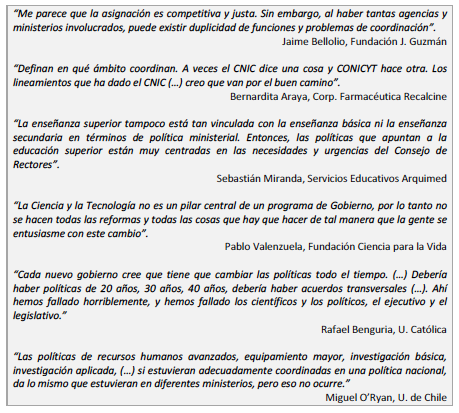 La persistencia en el tiempo de este comportamiento estaría vinculada a dos motivos principales. En primer lugar, una percepción bastante generalizada en el país respecto a que la inversión en investigación científica y tecnológica es relevante pero no prioritaria, lo que determina que se posterguen los aumentos presupuestarios a favor de otras urgencias. En segundo término, no existiría consenso entre los actores claves de la institucionalidad política y económica sobre los objetivos a corto y largo plazo del sistema chileno de Ciencia y Tecnología; ni tampoco sobre la calidad, potencial y relevancia de la producción científica nacional.
