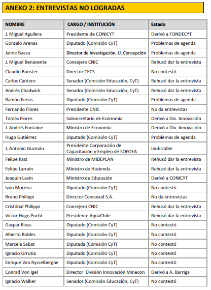 Como una muestra de la importancia que las autoridades chilenas asignan a la política científica, a continuación se presenta un cuadro con las diferentes personas que declinaron colaborar en el estudio o bien simplemente no ofrecieron ninguna respuesta: