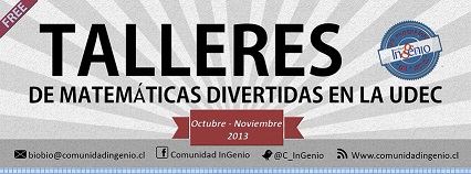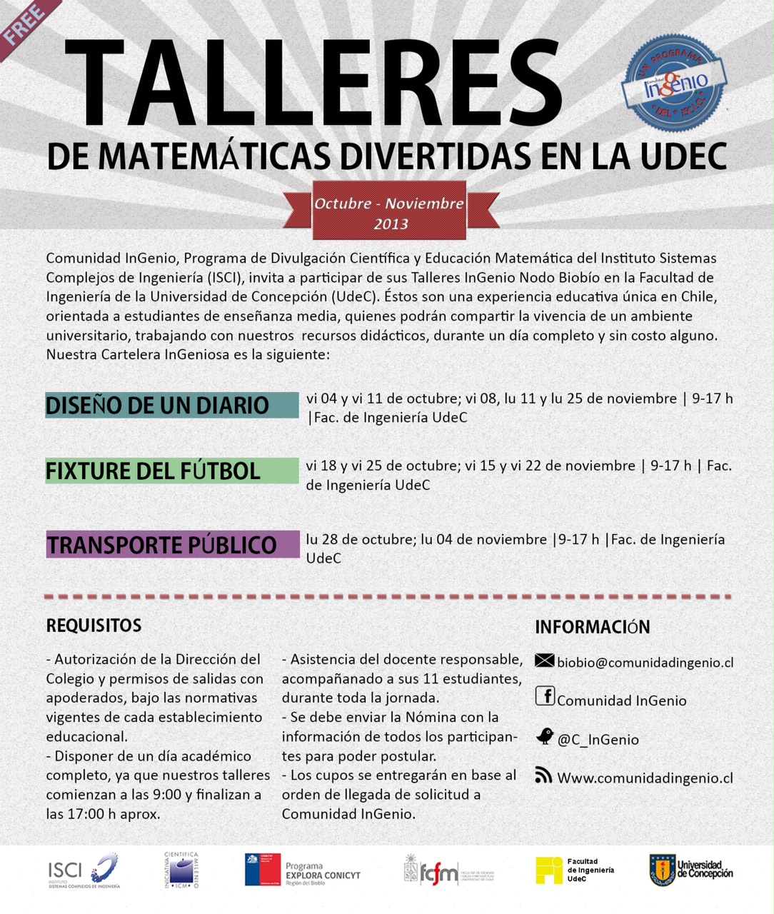 Comunidad InGenio, Programa Divulgación Científica y Educación Matemática del Instituto Sistemas Complejos de Ingeniería (ISCI), invita a participar de sus Talleres InGenio Nodo Biobío en la Universidad de Concepción (UdeC). Éstos son una experiencia educativa única en Chile, orientada a estudiantes de enseñanza media, quienes podrán compartir la vivencia de un ambiente universitario, trabajando con nuestros recursos didácticos, durante un día completo y sin costo alguno.