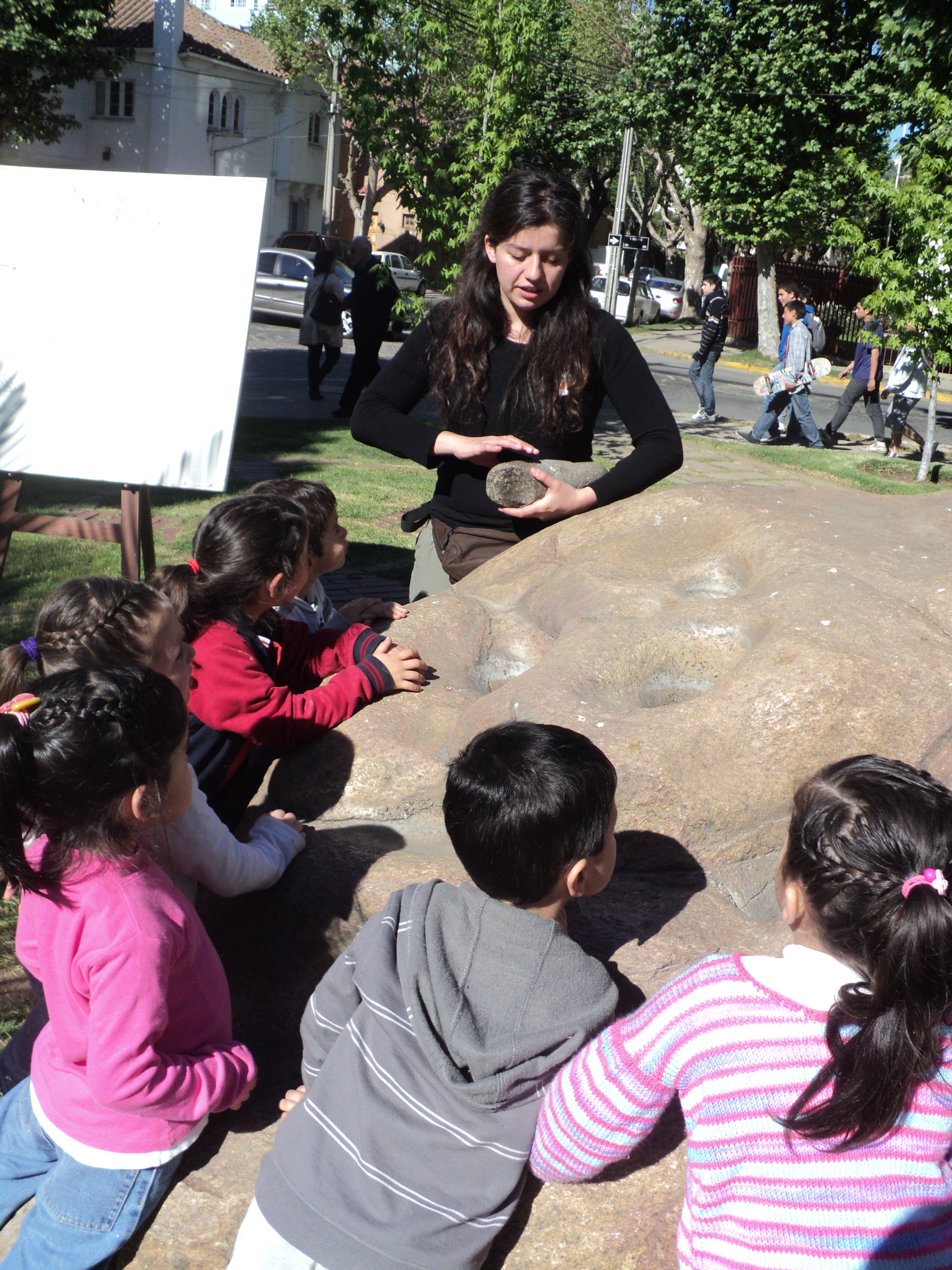 En la fotografía : Arqueóloga Andrea Martínez dicta charla para niños en torno a una piedra tacita en el exterior del Museo Fonck (Archivo).