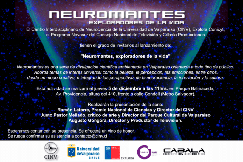 El Centro Interdisciplinario de Neurociencia de la Universidad de Valparaíso (CINV), Explora Conicyt, el Programa Novasur del Consejo Nacional de Televisión y Cábala Producciones , invitan al lanzamiento de «Neuromantes, exploradores de la vida»