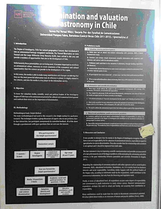 Teresa Vernal, Magíster en Comunicación y Educación y Doctoranda en Comunicación (UPF) presentó el póster titulado “Dessemination and valuation of astronomy in Chile”. En éste, la periodista y colaboradora de la Unidad de Astronomía de la Universidad de Antofagasta, dio cuenta de algunos resultados de su tesis doctoral, como es el caso del rol que cumplen los responsables de la divulgación y valoración de las potencialidades astronómicas en la Región de Antofagasta. Entre ellos medios de comunicación, científicos, entidades sociales y políticos.