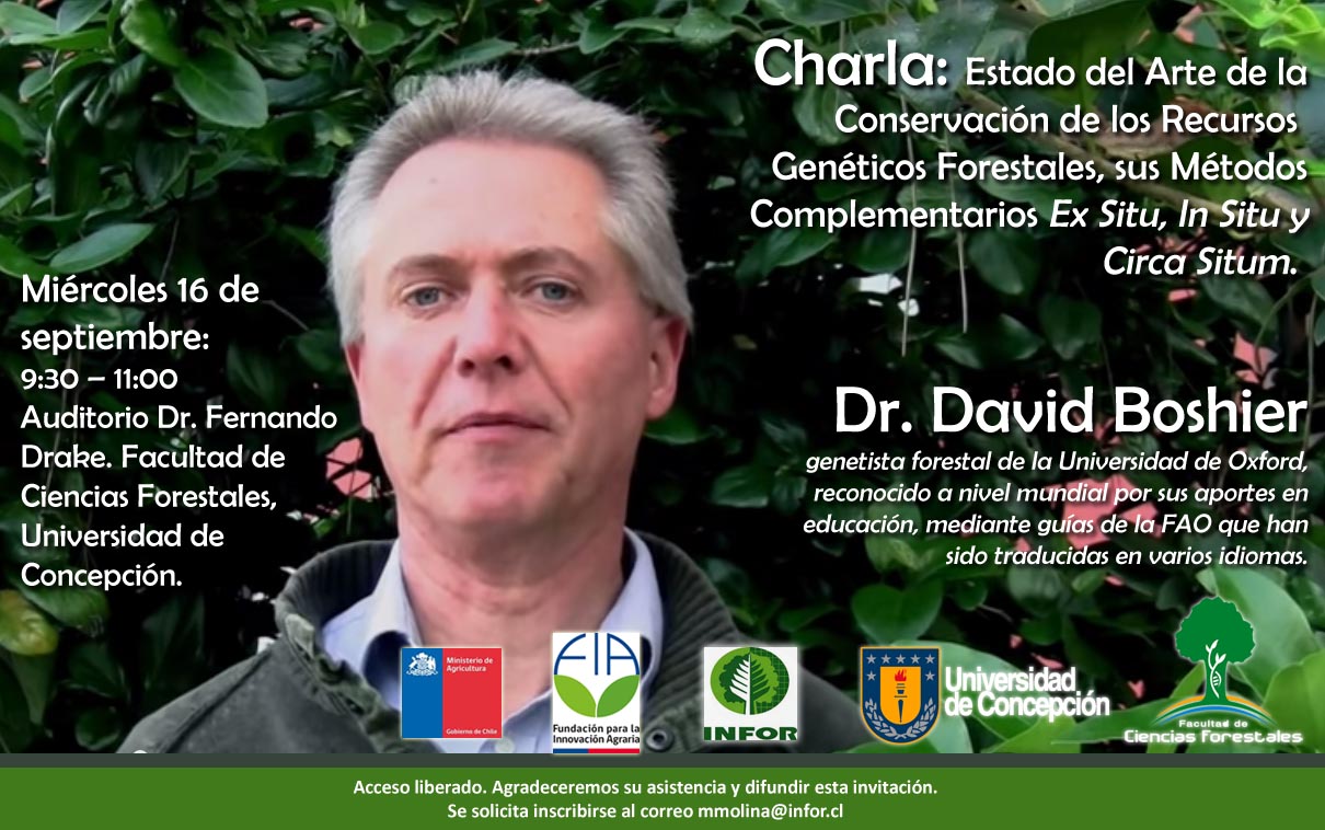 Como una forma de concientizar sobre la importancia de los recursos genéticos forestales (RGF), que corresponde al material hereditario propio de arbustos y árboles que formar parte de los bosques, el Dr. David Boshier, genetista forestal de la Universidad de Oxford Inglaterra, reconocido a nivel mundial por sus aportes en educación sobre conservación genética y la creación de guías de la FAO que han sido traducidas en varios idiomas, presentará la charla abierta a toda la comunidad “Estado del Arte de la Conservación de los Recursos Genéticos Forestales, sus Métodos Complementarios Ex Situ, In Situ y Circa Situm” en la Facultad de Ciencias Forestales de la Universidad de Concepción.