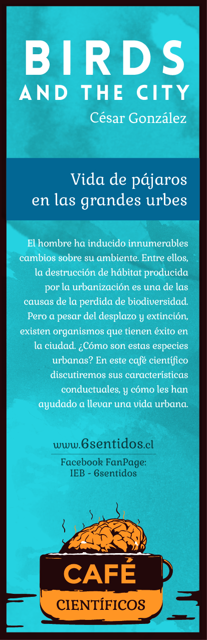 La tercera jornada de los Cafés Científicos organizados por 6 Sentidos-IEB en conjunto con la municipalidad de Providencia, se realizará este jueves 10 de Septiembre en el Centro Comunitario de Bellavista, ubicado en Constitución 85 a las 19:00. En la ocasión, el expositor será César Gonzales, postdoctorante de Olga Barbosa, UACh. El tema tratará sobre las estrategias que algunas especies nativas utilizan para sobrevivir en la ciudad.