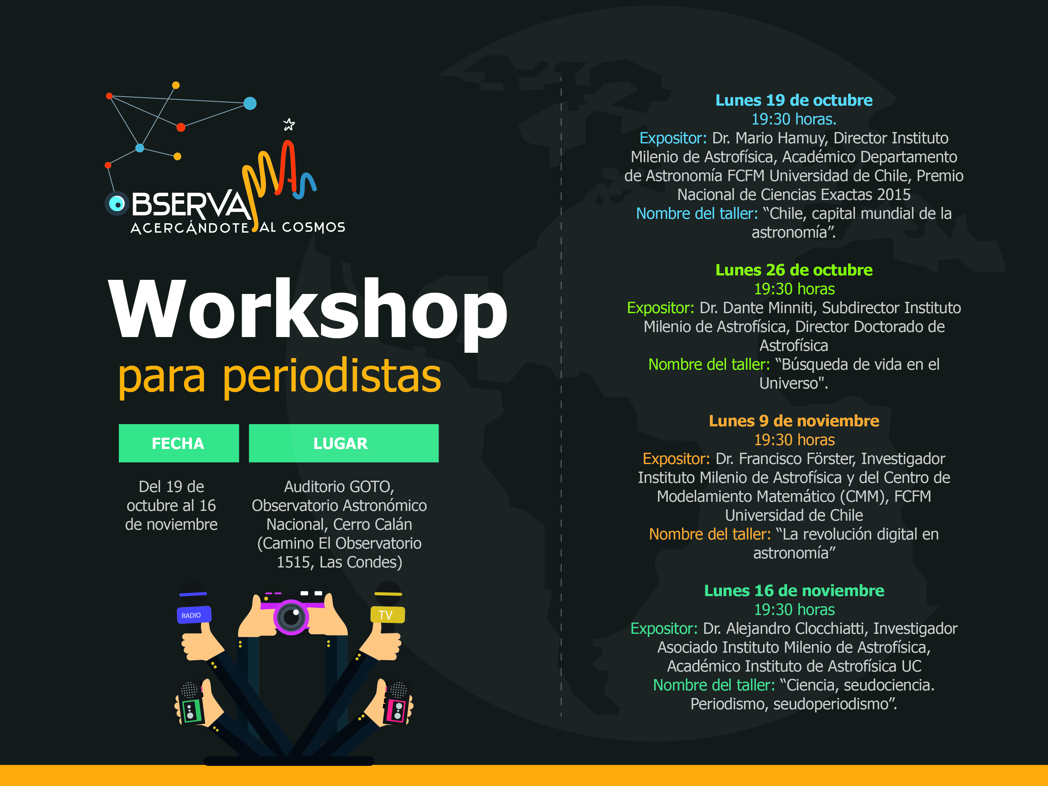 Este taller tiene por objetivo introducir a los profesionales al fascinante mundo de la astronomía, repasando conceptos básicos de esta disciplina, que les permitan informar de manera correcta a la audiencia o a los visitantes de sus centros, sobre los constantes descubrimientos que se están realizando desde Chile en esta ciencia.