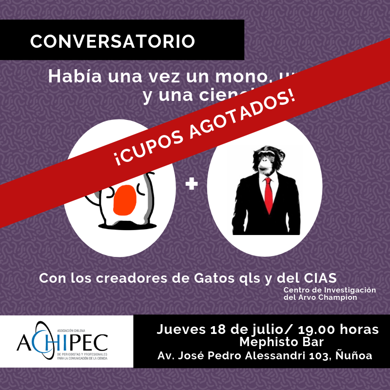 El próximo jueves 18 de julio, ACHIPEC, Asociación Chilena de Periodistas y Profesionales de Comunicación de la Ciencia, invita a un conversatorio para hablar de humor y ciencia en redes sociales con los creadores de GatosQls y del CIAS (Centro de Investigación del Arvo Champion). Esta actividad se realizará a las 19.00 horas en Mephisto Bar, ubicado en Av. José Pedro Alessandri 103, Ñuñoa (Metro Chile España).