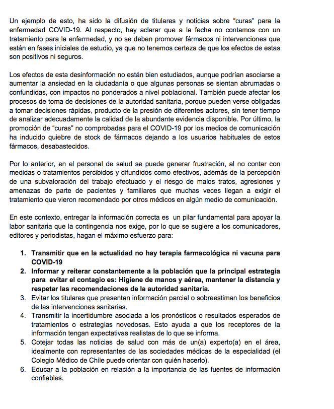 «Entregar la información correcta es un pilar fundamental para apoyar la labor sanitaria que la contingencia nos exige», estipulan en su carta abierta, enfatizando en la importancia de transmitir que en la actualidad no hay terapia farmacológica ni vacuna para el COVID-19, y reiterando las medidas de prevención: higiene de manos y aérea, mantener distancia y respetar las recomendaciones de la autoridad sanitaria.