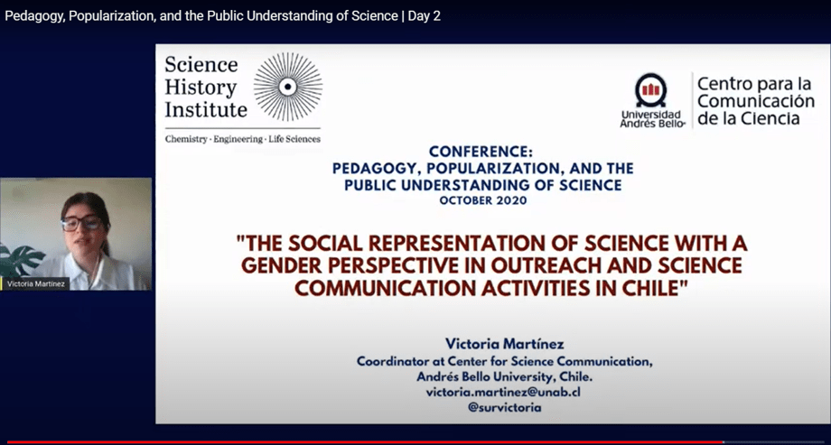 El pasado 22 y 23 de octubre, el Science History Institute, organismo estadounidense dedicado a la preservación y promoción de la historia de la ciencia, realizó la conferencia internacional “Pedagogy, Popularization, and the Public Understanding of Science”. En esta conferencia online participaron 25 expositores de distintos países, entre estos la periodista y socia Achipec Victoria Martínez, actual Coordinadora del Centro para la Comunicación de la Ciencia de la Universidad Andrés Bello.