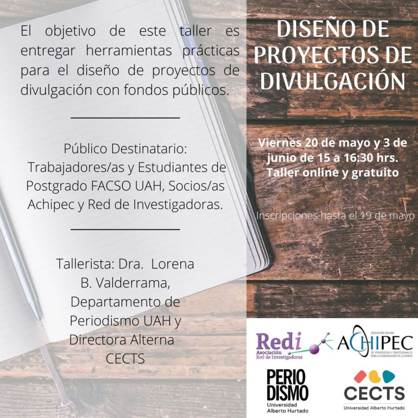 La actividad tiene por objetivo entregar herramientas prácticas para el diseño de proyectos de divulgación con fondos públicos y está dirigido a trabajadores/as y estudiantes de la Facultad de Ciencias Sociales de la Universidad Alberto Hurtado (UAH) y a socios/as la Red de Investigadoras y ACHIPEC.