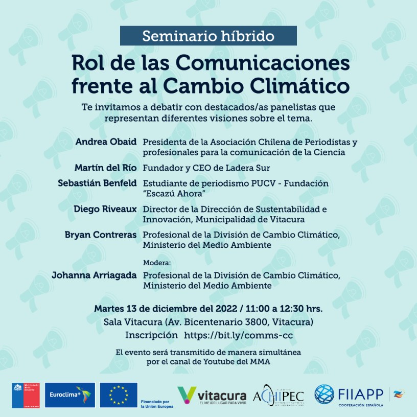 El próximo martes 13 de diciembre, a contar de las 11.00 hrs, el Ministerio del Medio Ambiente (MMA) con el apoyo del programa EUROCLIMA+ a través de la Fundación Internacional y para Iberoamérica de Administración y Políticas Públicas (FIIAPP) realizarán el seminario “El rol de las comunicaciones ante el Cambio Climático” con el objetivo de reflexionar sobre el aporte que deben realizar los medios de comunicación, tradicionales y alternativos, para contribuir a sensibilizar a la población sobre los impactos, efectos y consecuencias que tiene el cambio climático, especialmente en nuestro país.